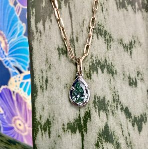 Custom pear-shaped green lab diamond pendant we created for a customer