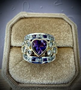 A recent custom design for a special customer, featuring amethysts and diamonds in a two-tone gold bezel setting