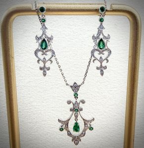 This stunning in-stock set features lush emeralds and glittering diamonds in the most delicate 18KW setting. Earrings priced amazingly at $2,800 and necklace lovingly priced at $3,200, or $6,000